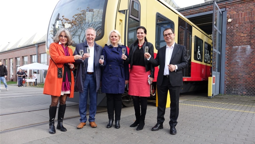 S-Bahnchef Peter Buchner, Verkehrssenatorin Regine Günther, Staatssekretärin Infrastruktur und Landesplanung des Landes Brandenburg, Ines Jesse, VBB-Chefin Susanne Henckel und Alexander Kaczmarek, DB-Konzernbevollmächtigter für Berlin stellten das generalüberholte und modernisierte Fahrzeug im S-Bahnwerk Schöneweide vor.